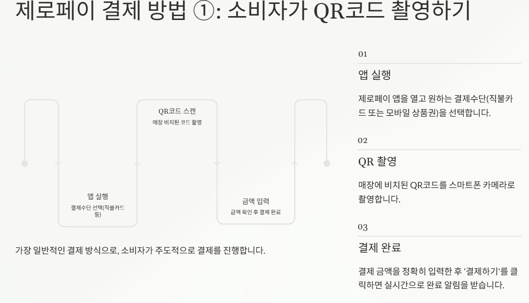 결제 구조 자체는 비교적 단순합니다. QR을 촬영하거나(소비자 주도), 반대로 소비자가 만든 QR을 사장님이 스캔하는 방식(매장 주도)으로 진행됩니다. 매장 환경(POS 연동 여부, 리더기 보유 여부)에 따라 선택이 달라질 수 있다는 점이 실무적으로 중요하게 작용했습니다.
