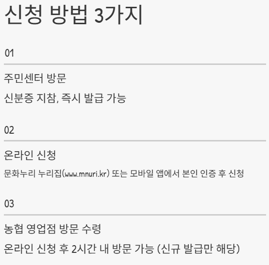 온라인 신청을 완료한 신규 신청자의 경우, 농협 영업점을 방문해 카드 수령이 가능합니다. 신청 후 약 2시간 이후부터 방문 수령이 가능하며, 이 역시 신분증이 필요합니다.