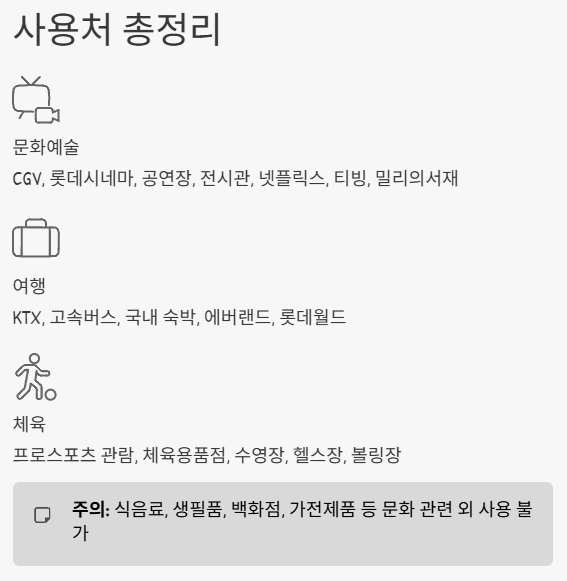 프로 스포츠 관람, 체육용품점, 수영장, 헬스장 등에서도 사용할 수 있습니다. 생활 체육 참여를 장려하기 위한 취지로, 사용 범위가 비교적 넓게 설정되어 있습니다.