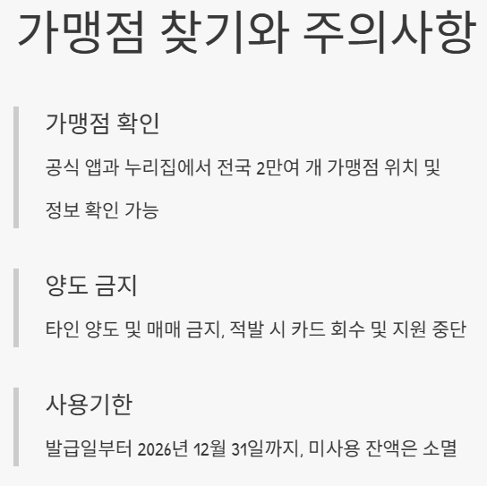 또한 카드 양도 및 매매는 금지되어 있으며, 적발 시 카드 회수 및 지원 중단 조치가 이루어집니다. 카드는 반드시 본인만 사용해야 하며, 가족 간 대리 사용 역시 허용되지 않습니다.