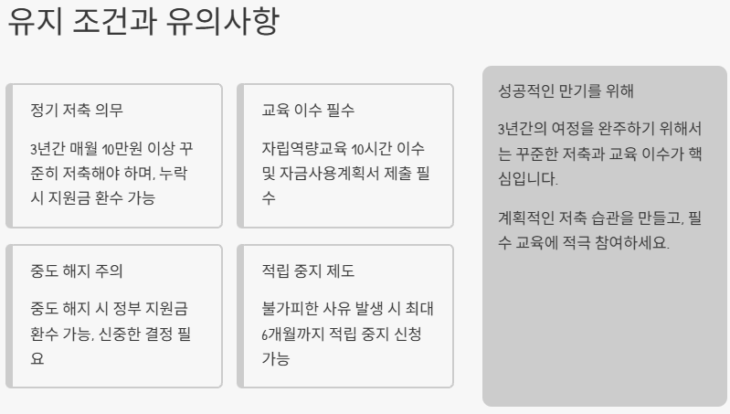 또한 자립 역량 강화를 위한 교육 이수가 필수입니다. 총 10시간의 교육을 이수하고, 자금 사용 계획서를 제출해야 만기 요건을 충족할 수 있습니다.