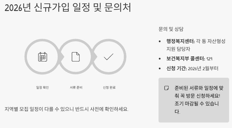 희망저축계좌2는 2026년 2월부터 신규 가입이 시작됩니다. 다만 모집 일정은 지역별로 다를 수 있어, 거주지 기준 행정복지센터를 통한 사전 확인이 필요합니다.