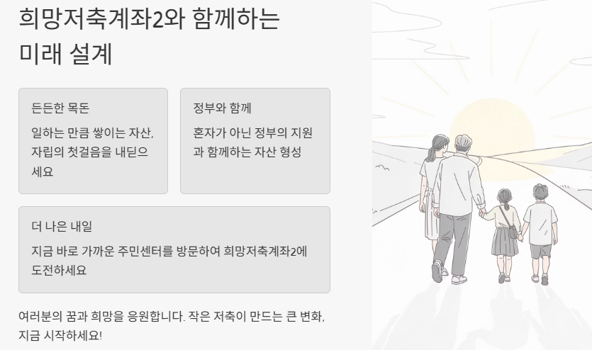 희망저축계좌2는 단순히 금액을 모으는 제도가 아니라, 저축 습관과 계획적인 자산 관리를 함께 설계하도록 유도하는 정책입니다.