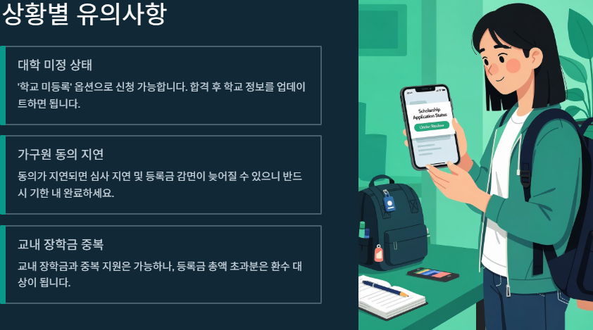 - 조기 신청의 힘 : 신청이 시작되면 가능한 한 빠르게 진행하는 방식이 등록금 부담 완화에 유리하다는 취지로 안내됐습니다.