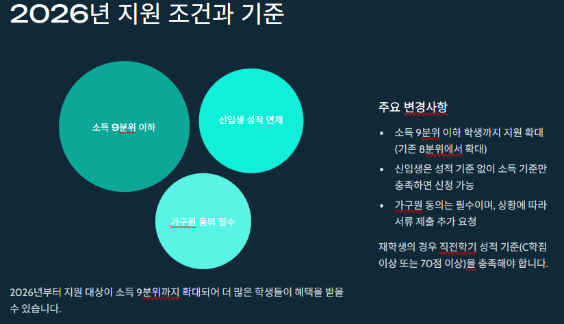 또한 카드에는 “기초생활수급자 및 차상위계층은 등록금 전액이 지원된다”는 메시지가 함께 제시돼 있었습니다. 이는 ‘최대치’ 개념의 안내이므로, 실제 반영은 신청 결과 페이지에서 확인하는 방식이 권장됐습니다.