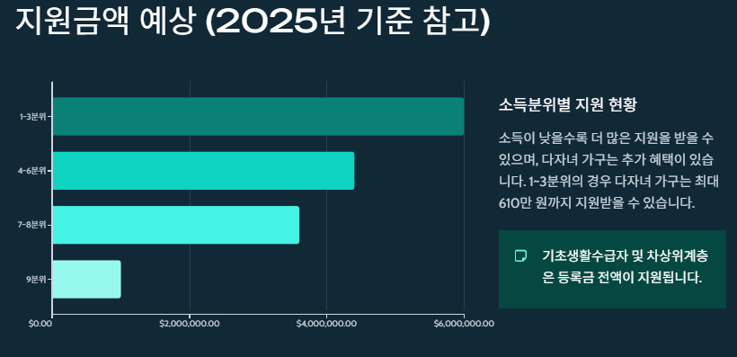 카드의 핵심 메시지는 단순했습니다. 소득이 낮을수록 더 많은 지원을 받을 수 있고, 다자녀 가구는 추가 혜택이 있을 수 있다는 흐름입니다. 또한 “1~3분위의 경우 다자녀 가구는 최대 610만 원까지 지원받을 수 있다”는 문구가 포함돼 있었습니다. 다만 이 금액은 제도·연도·개인 조건에 따라 달라질 수 있어, 본 신청 화면의 산정 결과를 최종 기준으로 삼는 편이 안전했습니다.