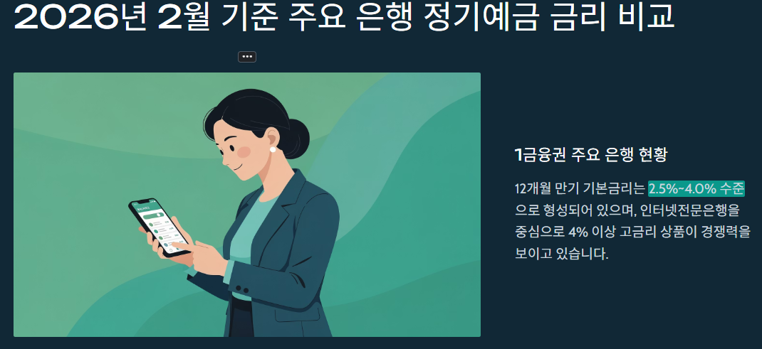 2026년 2월 정기예금 시장은 1금융권의 안정 구간과 인터넷전문은행의 비대면 경쟁, 그리고 저축은행·상호금융권의 조건형 고금리 구간이 함께 존재하는 형태로 관측됐습니다. 이 때문에 “가장 높은 숫자”를 찾는 접근보다, 내가 받을 수 있는 금리(적용 금리)와 내 자금 목적에 맞는 구조를 고르는 접근이 현실적인 선택으로 이어졌습니다.