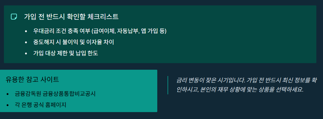 가입 전 체크리스트(우대 조건/중도해지/대상 제한)를 먼저 점검하고, 공식 공시로 최신 정보를 확인한 뒤 결정하는 흐름이 안전하게 작동했습니다. 금리 변동이 잦은 시기일수록 “가입 직전 확인”이 결과를 좌우하는 변수로 반복적으로 언급됐습니다.