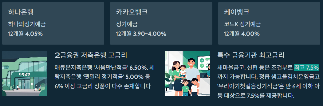 카드 자료에서 또 하나 주목된 부분은 “특수 금융기관 최고 금리” 안내였습니다. 새마을금고, 신협 등은 조건에 따라 높은 수치를 제시할 수 있다는 메시지가 포함됐고, 특히 “최고 7.5%”와 같은 수치가 등장했습니다.
