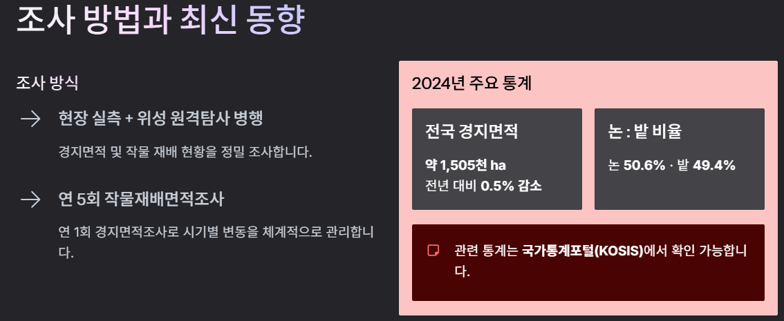 관련 통계는 국가통계포털(KOSIS)에서 확인 가능하다고 안내되는 경우가 많습니다. 통계를 직접 확인하면 “우리 지역의 경지면적 변화” 같은 로컬 흐름도 함께 파악할 수 있어, 뉴스형 이슈를 이해하는 데 도움이 됩니다.