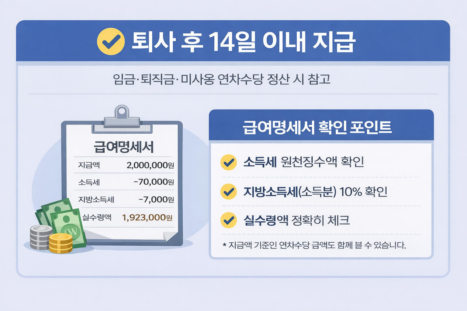 이 글의 초점은 “세금과 실수령액”이므로, 연차수당 산정(통상임금/평균임금) 디테일은 다음 편(퇴사 연차수당 계산법)에서 더 크게 다루는 구성이 효율적이었습니다.