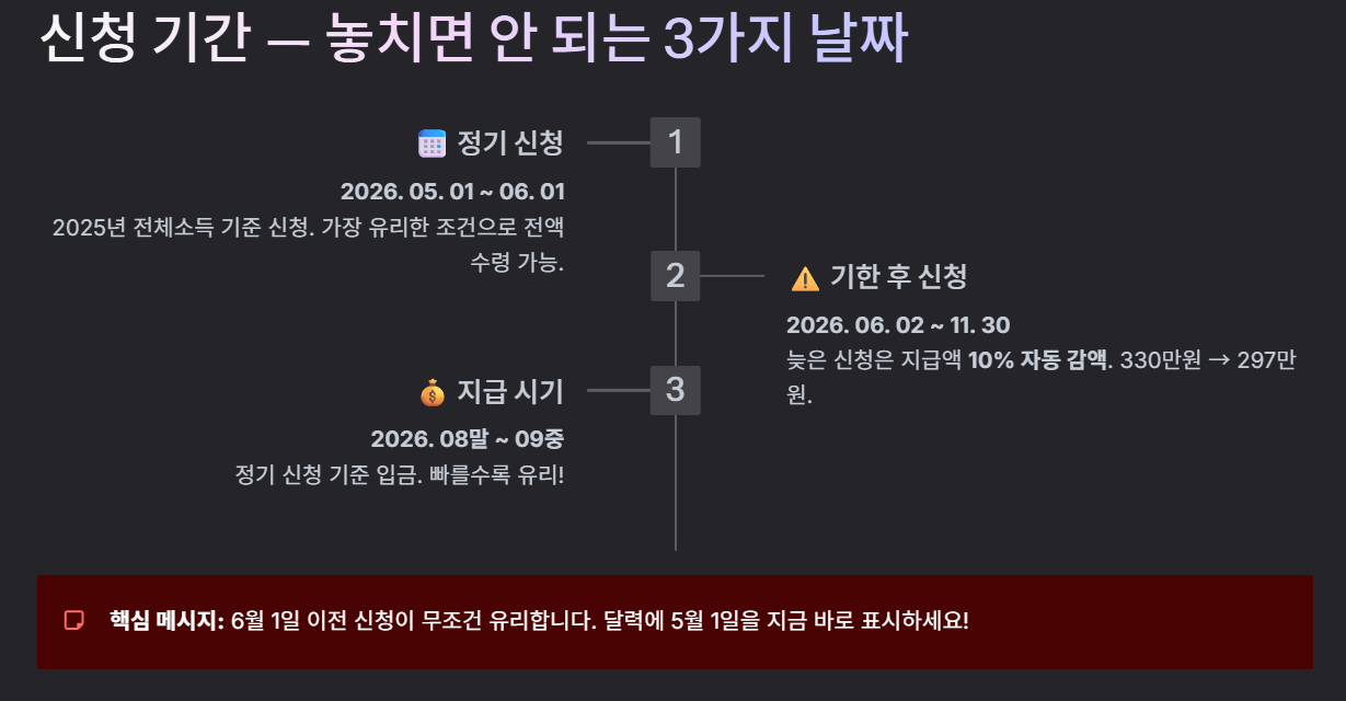특히 기한 후 신청은 편하다고 생각하고 미루기 쉽지만, 실제로는 감액이라는 불이익이 따라옵니다. 예를 들어 최대 330만 원 구간에 해당하더라도 감액이 적용되면 수령액이 줄어들 수 있기 때문에, 신청 가능 대상이라면 정기 신청 기간 안에 끝내는 것이 가장 유리합니다.