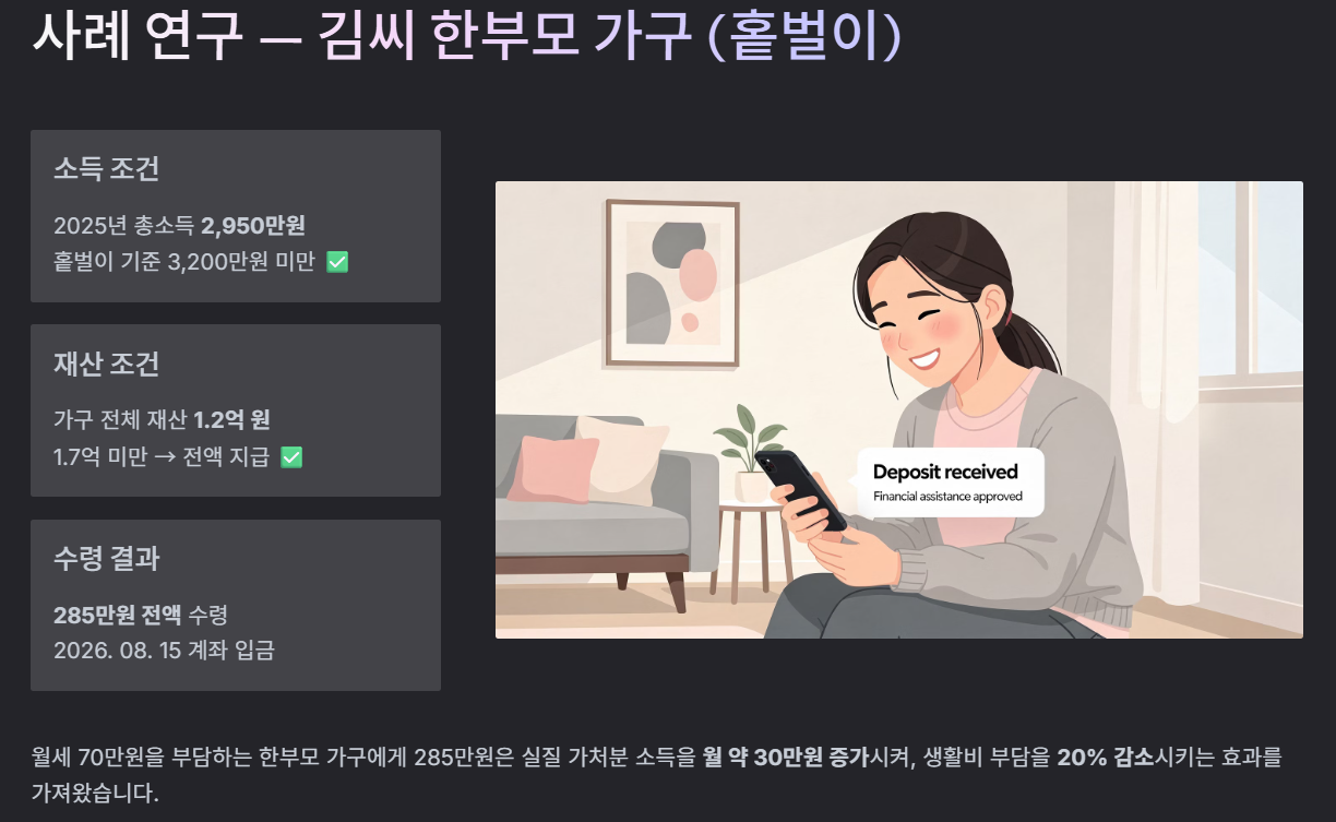제도 설명만 읽으면 막연하게 느껴질 수 있지만, 실제 가구 상황에 대입해 보면 흐름이 훨씬 분명해집니다. 예를 들어 홑벌이 한부모 가구가 총소득 기준을 충족하고, 재산 합계도 전액 지급 구간에 해당한다면 장려금은 생활비 부담을 직접 낮추는 역할을 하게 됩니다.