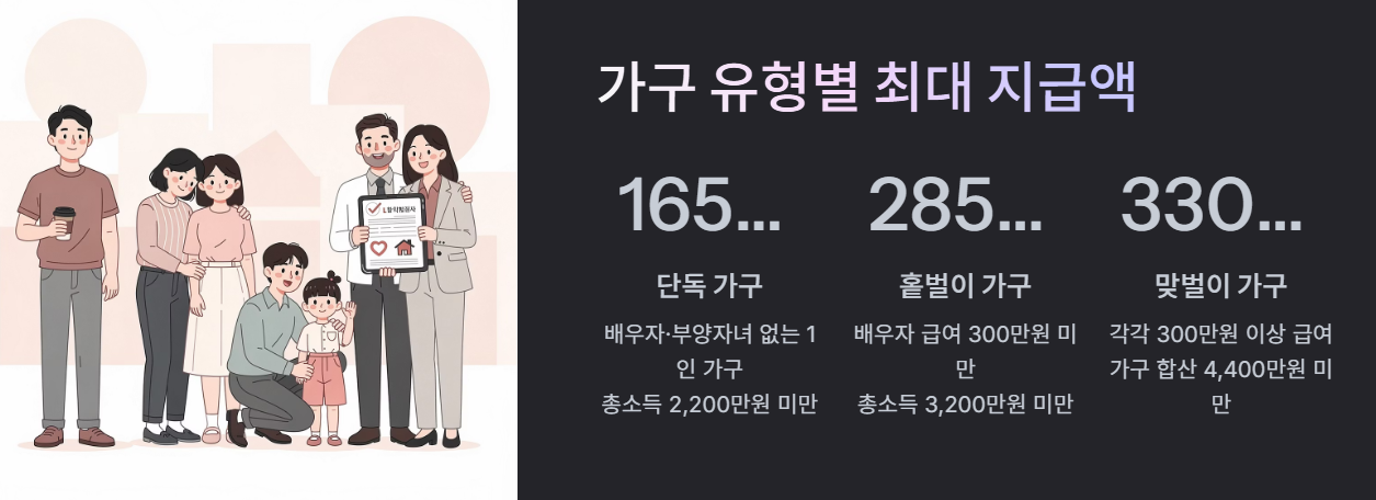 일반적으로 많이 알려진 최대 지급액은 단독가구 165만 원, 홑벌이가구 285만 원, 맞벌이가구 330만 원 수준입니다. 이 차이는 단순히 가족 수 때문이 아니라, 생활비 부담과 가구 구조를 함께 고려한 결과로 이해할 수 있습니다. 그래서 같은 근로소득이 있어도 가구 유형에 따라 기대 가능한 수령 규모가 달라졌습니다.