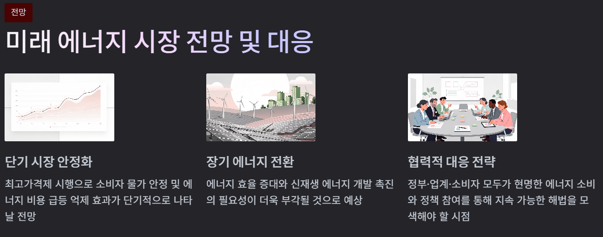 앞으로의 전망은 단기 안정과 장기 전환이라는 두 갈래로 나뉩니다. 단기적으로는 소비자 물가 안정과 에너지 비용 급등 억제 효과가 기대됐고, 장기적으로는 에너지 효율 개선과 대체 에너지 확대 필요성이 더 강하게 제기될 것으로 보입니다.