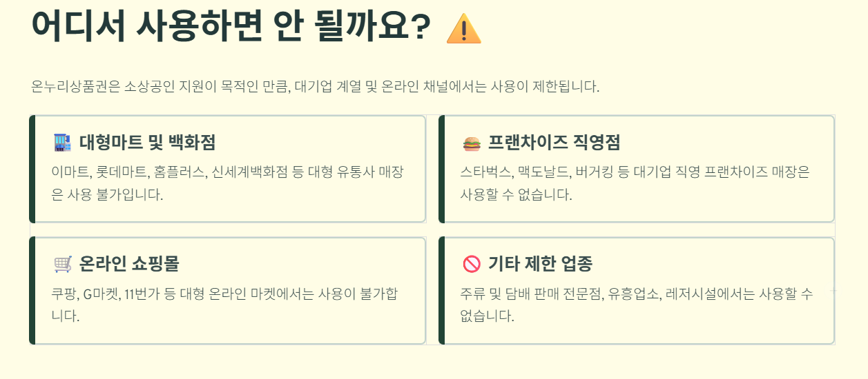 온누리상품권은 사용처가 넓어졌지만, 그렇다고 모든 업종에서 자유롭게 결제되는 구조는 아닙니다. 제도의 목적 자체가 전통시장과 소상공인 지원에 있기 때문에, 대형 유통과 특정 제한 업종에서는 사용이 제한됩니다. 이 부분을 모르고 방문했다가 결제가 안 되어 당황하는 경우가 많았습니다.
