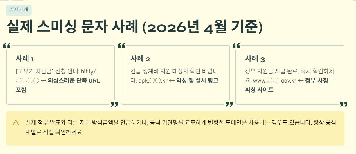 결국 중요한 것은 문자 내용 자체보다도, 그 문자가 클릭을 유도하는 방식과 정보 입력을 요구하는 구조를 함께 보는 것입니다. 겉으로는 정부 지원금 안내처럼 보여도, 링크 클릭과 개인정보 입력을 유도한다면 이미 매우 위험한 신호로 보셔야 합니다.