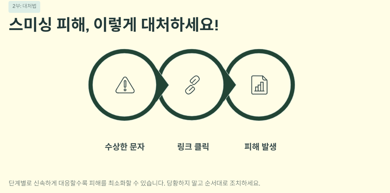 스미싱 대처는 클릭 전과 클릭 후로 나눠서 봐야 합니다. 아직 링크를 누르지 않았다면 피해를 거의 막을 수 있지만, 이미 눌렀다면 신속하게 통신과 앱 상태를 점검하고 신고까지 이어가야 합니다. 중요한 것은 당황하지 않고 순서대로 조치하는 것입니다.