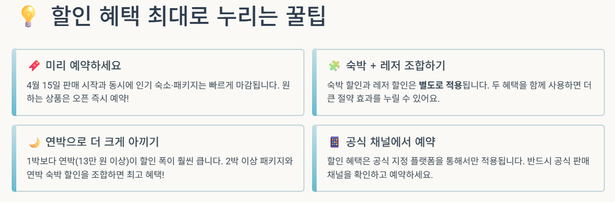정책 안내상 판매는 5월 31일까지지만, 혜택 제공 인원은 한정돼 있습니다. 인기 숙소와 패키지는 판매 기간 종료 전에도 선택지가 급격히 줄어들 수 있습니다. 따라서 일정을 정했다면 가능한 한 빨리 확인하는 편이 좋았습니다.