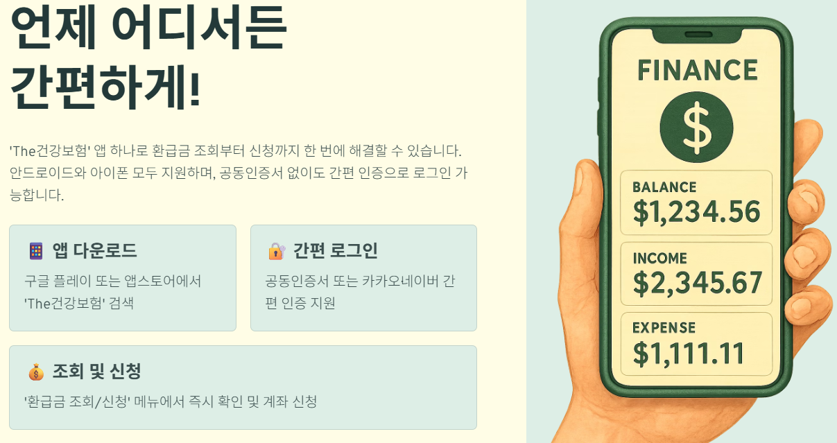 스마트폰으로 해결하고 싶은 분들에게는 The건강보험 앱이 훨씬 간편합니다. 별도의 컴퓨터가 없어도 이동 중에 바로 접속해 확인할 수 있고, 인증 절차도 예전보다 단순해졌기 때문에 실제 체감 편의성은 상당히 높습니다. 특히 젊은 세대뿐 아니라 부모님 환급 여부를 대신 확인해드릴 때도 앱이 더 실용적이라는 평가가 많습니다.