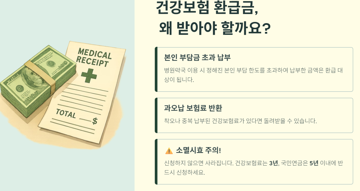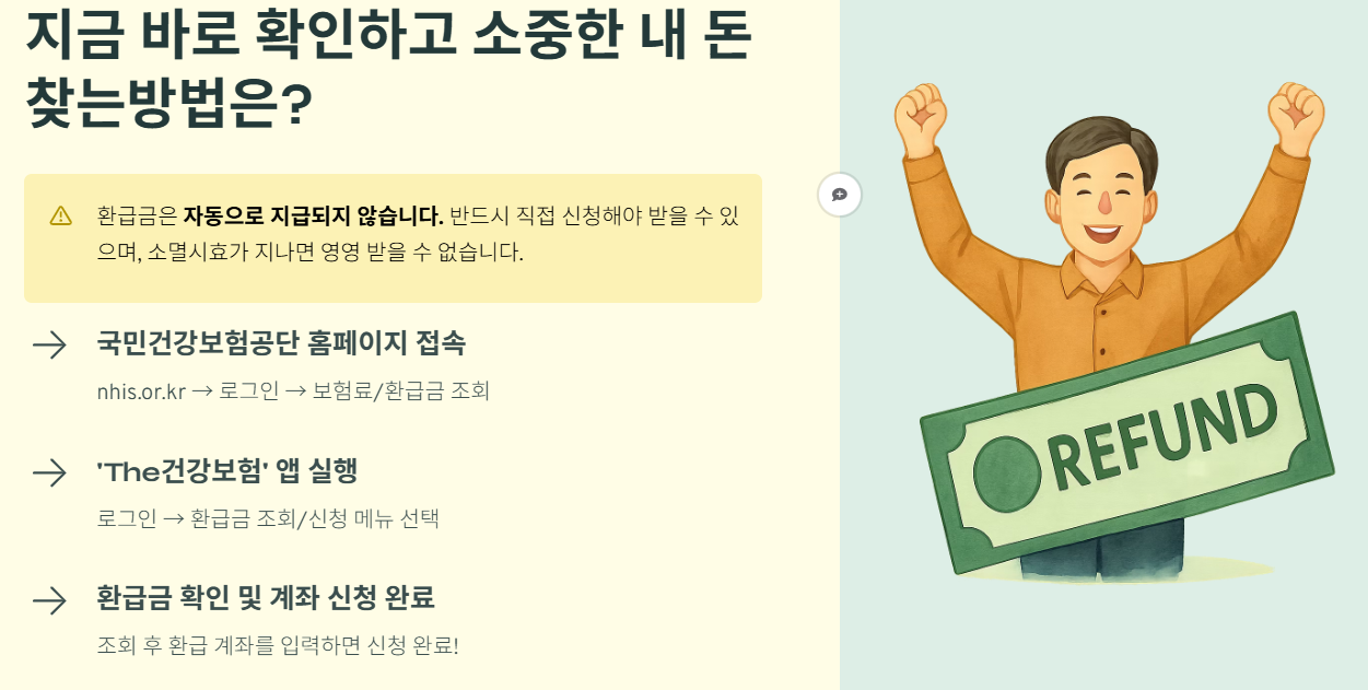 많은 분들이 “나는 해당이 없을 것 같다”고 생각하지만, 실제로는 퇴사 후 지역가입자로 잠시 전환됐다가 다시 직장가입자로 편입되는 과정에서 보험료가 중복 정산되는 사례도 있고, 의료비 지출이 큰 해 이후 본인부담상한제 대상이 되는 경우도 있습니다. 이런 환급금은 확인하지 않으면 그대로 지나가기 쉽고, 신청기한까지 놓치면 받을 수 없는 경우도 있기 때문에 미리 흐름을 알아두는 것이 중요합니다.
