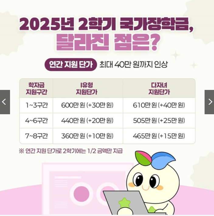 - 근로장학금 : 선발 규모가 기존 14만 명에서 20만 명으로 대폭 확대되어 더 많은 학생이 근로 기회를 얻습니다.