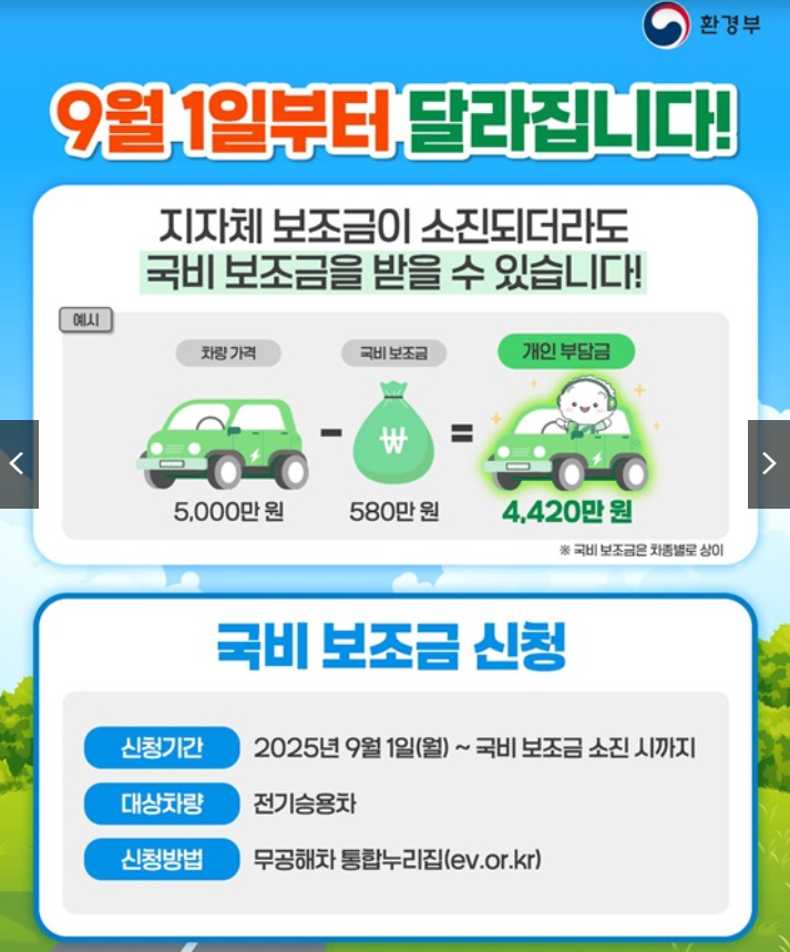 2025년 9월 1일부터 지자체 보조금이 없어도 국비 보조금만으로 전기차를 구매할 수 있는 제도가 시행되었습니다. 이제는 지역 예산이 빨리 소진되더라도, 국비만으로 지원을 받을 수 있어 전기차 구매 부담이 한층 줄어듭니다.