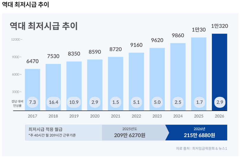- 최저시급: 10,320원 (’25년 10,030원 → +290원, +2.9%)